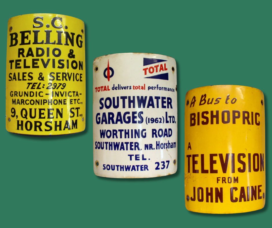 We’ve had a little look into the archives and found these three local advertising signs. They are curved so they could fit round the pole and be nailed on.