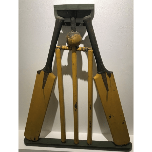 This strange object of two cricket bats, three stumps, two bails and one cricket ball, all held together with a metal support and mounted top and bottom onto a wooden plinth was used by Attwater Brothers in Market Square, Horsham.